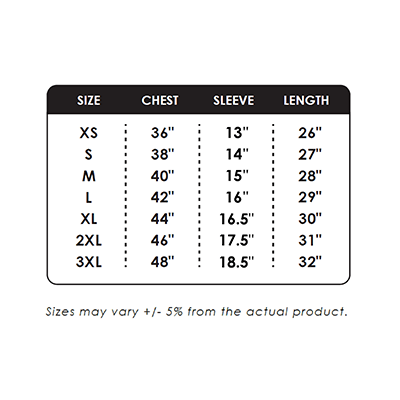 XS, S, M, L, XL, 2XL, 3XL