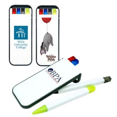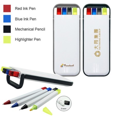 This Pens & Highlighter Set features Black, Blue & Red ball pen together with a Yellow Highlighter in one pouch for easy carry. Great tool for teachers, office use, and students. Large area imprint logo.